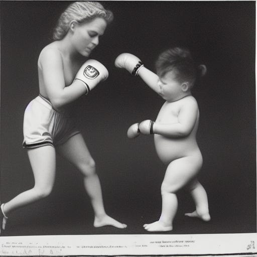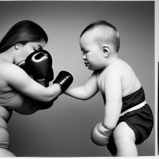 The first result for “a realistic photo of a baby boxing a woman.”