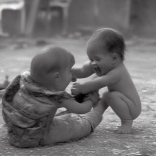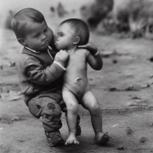Excuse my language, but holy fucking shit. THIS is what a computer comes up with? One baby in fatigues and the other naked - possibly with only one leg and a really big bulging biceps. The look of urgency on both of these baby’s faces…the one baby helping the other…the possible dead baby hand on the left side of the image, ad the possible fallen bodies out of focus in the background.